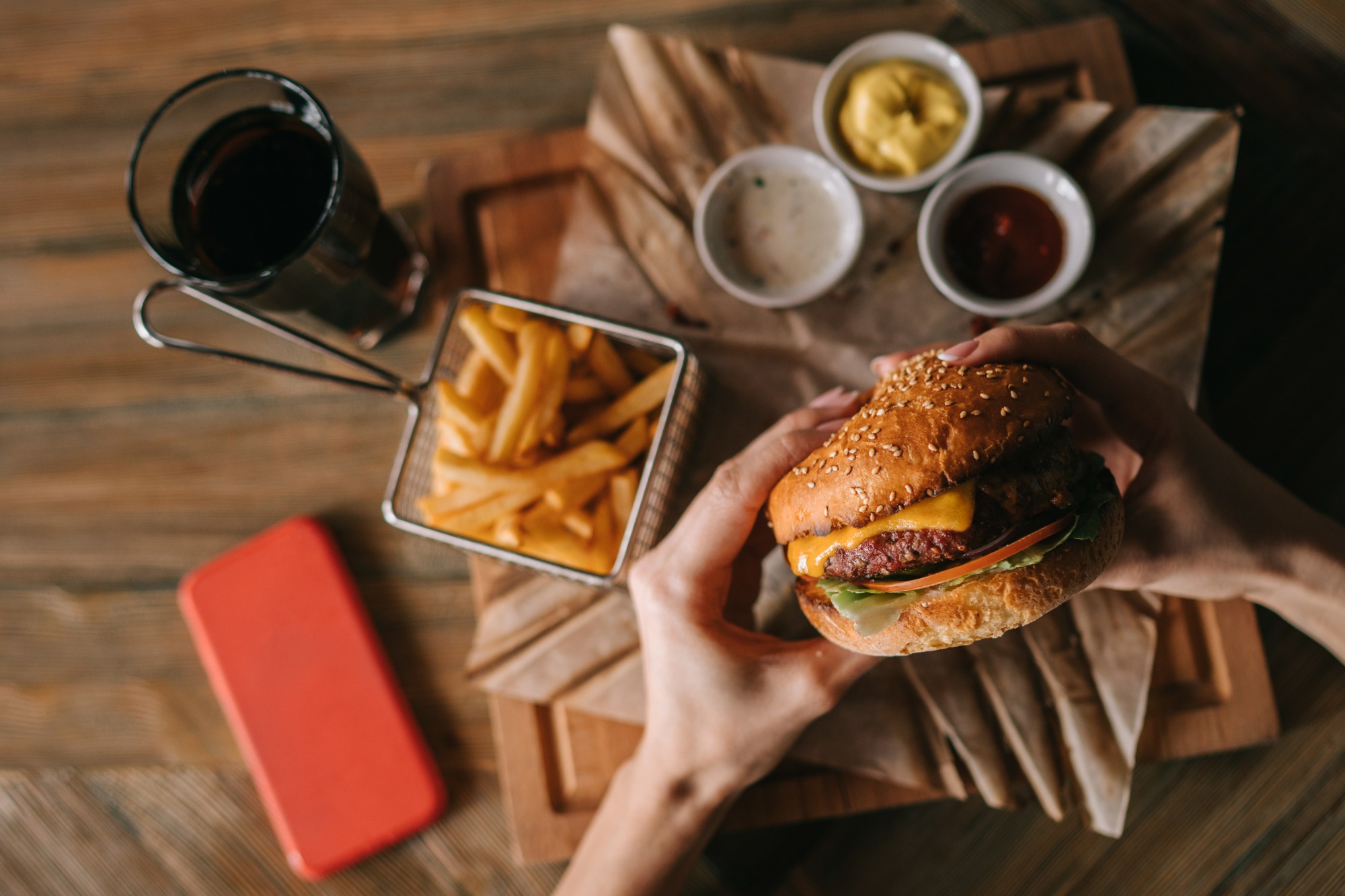 wołowina, jajko sadzone, bekon, cebula, ogórek, sos BBQ -
